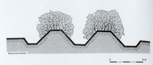 Dieser idealisierte Querschnitt durch eine intakte Landwehr soll einen Eindruck vermitteln, wie die jetzt noch vorhandenen Bodenerhebungen ursprünglich angelegt waren. Deutlich erkennbar ist hier die Heckenbepflanzung und das angelegte Grabensystem. Durch diese Ansicht wird deutlich, dass die Landwehr gerade für Lasten transportierende Wagen und Karren ein fast unüberwindliches Hindernis war.
