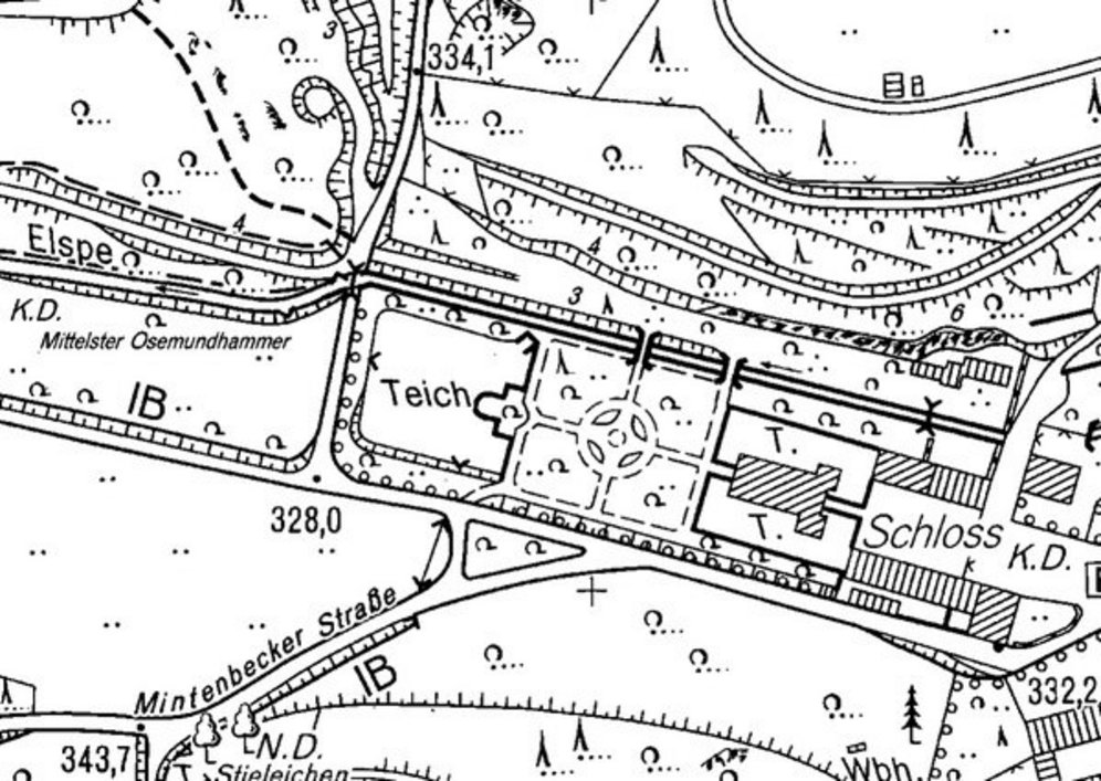Unterhalb der Schlossanlage sind heute noch deutlich im Gelände die Reste des Mitlleren Osemundhammers zu Neuenhof erkennbar. Dietrich Woeste zählt diesen neben dem Obersten und Untersten Osemundhammer zu den ältesten Anlagen ihrer Art. Wenn auch die historische Überlieferung nicht weiter als in die Zeit nach dem Dreißigjährigen Krieg, also in die Mitte des 17. Jahhunderts zurückreicht, so haben die neueren Funde um den Neuenhof im oberen Elspetal um so mehr den Beweis erbracht, dass die Tradition der Eisenverhüttung und verarbeitung in diesem Tal viel älter ist und mindestens in das 14. Jahrhundert zurückreicht.