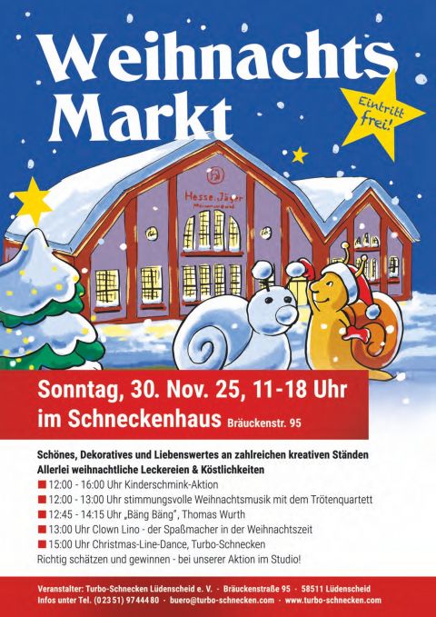 Der Weihnachtsmarkt mit 40 Ausstellern findet im und am Schneckenhaus am 30. November von 11:00 bis 18:00 Uhr statt.
