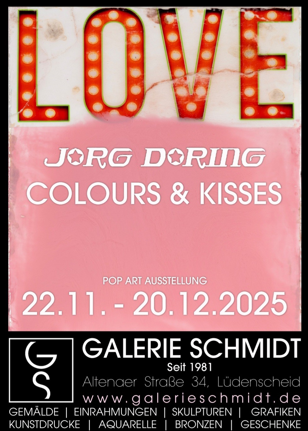Die Galerie Schmidt präsentiert vom 22.11. - 20.12.2025 eine neue Ausstellung mit Werken des bekannten Düsseldorfer Pop-Art Künstlers Jörg Döring. Unter dem Titel "Colours & Kisses" zeigt die Galerie eine Auswahl seiner neuesten Arbeiten, in denen Comic, Film, Popkultur und gesellschaftliche Themen auf unverwechselbare Weise verschmelzen.