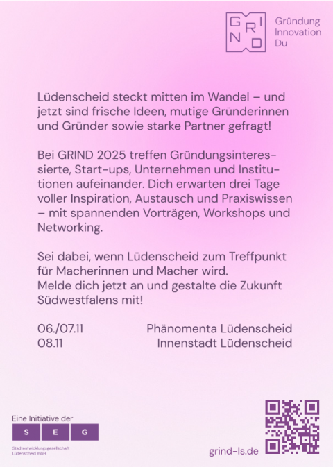 Let's GRIND! Vom 6. bis 8. November 2025 findet in Lüdenscheid erstmals GRIND statt – die neue, dreitägige Plattform für Gründung, Innovation, Unternehmensnachfolge und Vernetzung in Südwestfalen. Egal ob Gründungsinteressierte, Studierende, Nachfolgende oder etablierte Unternehmen: GRIND bietet praxisnahe Workshops (Businessplan, Finanzierung, Marketing, Steuern), inspirierende Gründer-Stories (u.a. von Tessa Meigies & Tom Priesnitz), einen Talk mit einem Lieferheld-Gründer, den innovativen "Pitch back" etablierter Firmen mit anschließendem Get-together und einen Stadtrundgang zu erfolgreichen Gründungen und Potenzialen in der Innenstadt. Die Teilnahme ist kostenlos. Ziel ist es, Wissen zu vermitteln, Kontakte zu knüpfen und die wirtschaftliche Zukunft Lüdenscheids gemeinsam zu gestalten. GRIND ist eine Initiative der SEG Lüdenscheid mit vielen starken Partnern aus der Region. Jetzt kostenfrei anmelden auf www.grind-ls.de!