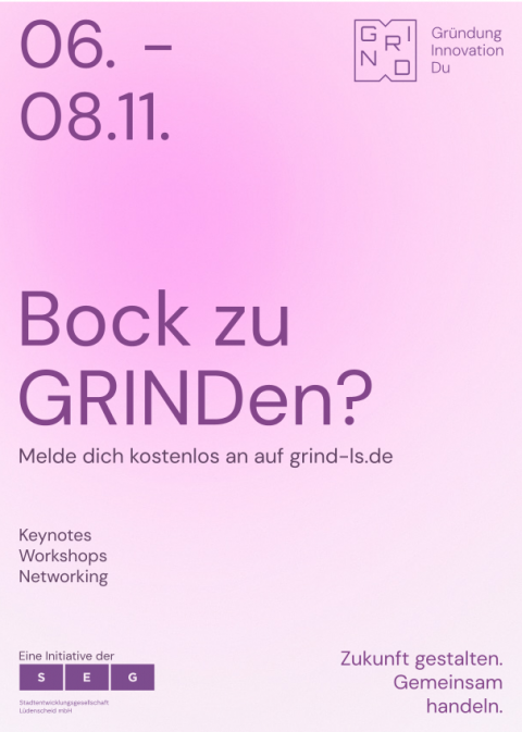 GRIND ist das neue Event für Gründung, Innovation & Nachfolge in Lüdenscheid. Vom 6.-8. Nov. gibt's Workshops, Talks (u.a. Lieferheld-Gründer), Networking & mehr für alle, die die Zukunft der Region gestalten wollen. Kostenfreie Anmeldung: www.grind-ls.de