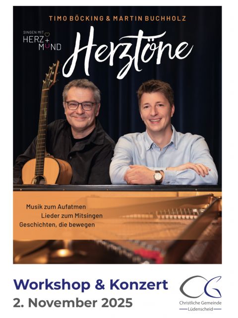 Erleben Sie einen Abend, der unter die Haut geht und das Herz weit macht! Songpoet Martin Buchholz und Pianist Timo Böcking laden Sie ein zum „Singen mit HERZ+MUND“ – einem Konzert, das mehr ist als nur Musik. Freuen Sie sich auf eine einzigartige Mischung aus berührenden Melodien, inspirierenden Geschichten und Liedern zum Mitsingen. Mit Texten über Zweifel und Zuversicht, Pläne und Pleiten, Sorgen und Segen, Wunden und Wunder. Mit Tiefgang und Leichtigkeit zugleich schaffen die Künstler Momente, die zum Innehalten und Aufatmen einladen.