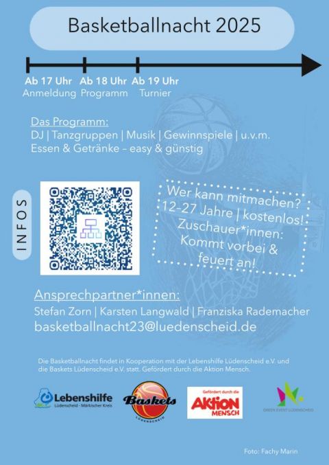 Ab 17 Uhr startet die Anmeldung für die Teams, um 18 Uhr geht das bunte Rahmenprogramm los – und ab 19 Uhr wird’s ernst beim großen Basketballturnier. Dann heißt es: Dribbeln, passen, treffen! Ob Teamplayer, Zuschauerin oder einfach sportbegeistert: Hier ist für alle was dabei!