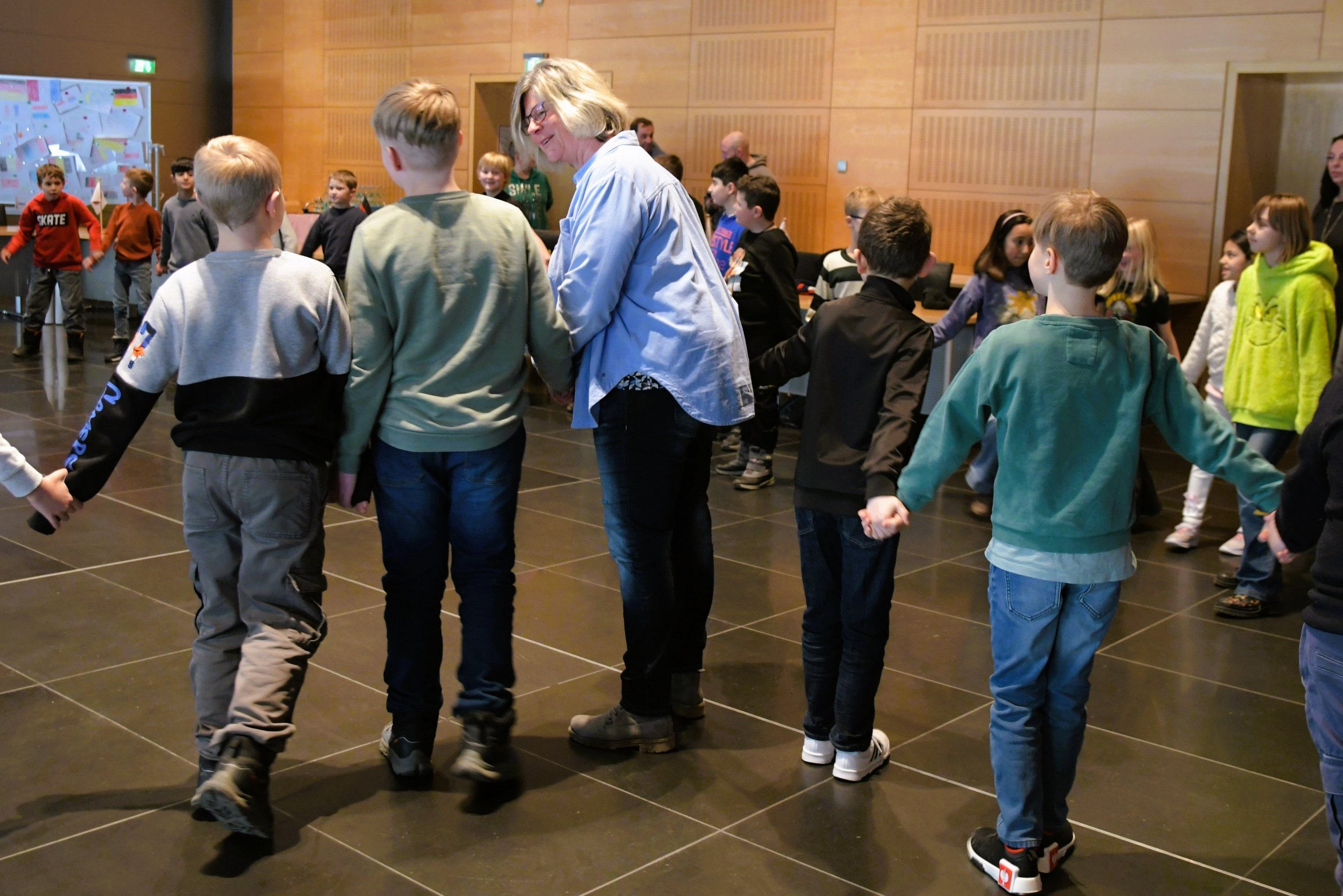 Claudia Stelse vom Fachdienst Rat und Bürgermeister hat die knapp 50 Jungen und Mädchen im Ratssaal in Empfang genommen und ihnen auf kindgerechte Weise die Themen Ratsarbeit, Demokratie und Städtepartnerschaften nähergebracht.