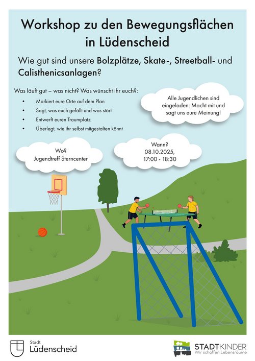 Wie gut sind die Bolzplätze in Lüdenscheid? Wie gut die Skate-, Streetball- und Calisthenicsanlagen? Zu diesen Fragen ist jetzt die Meinung von Jugendlichen gefragt. In einer Zukunftswerkstatt haben sie die Möglichkeit, die Bewegungsflächen in der Stadt zu beurteilen. Der Workshop findet am Mittwoch, 8. Oktober, von 17 bis 18.30 Uhr im Jugendtreff Sterncenter statt.