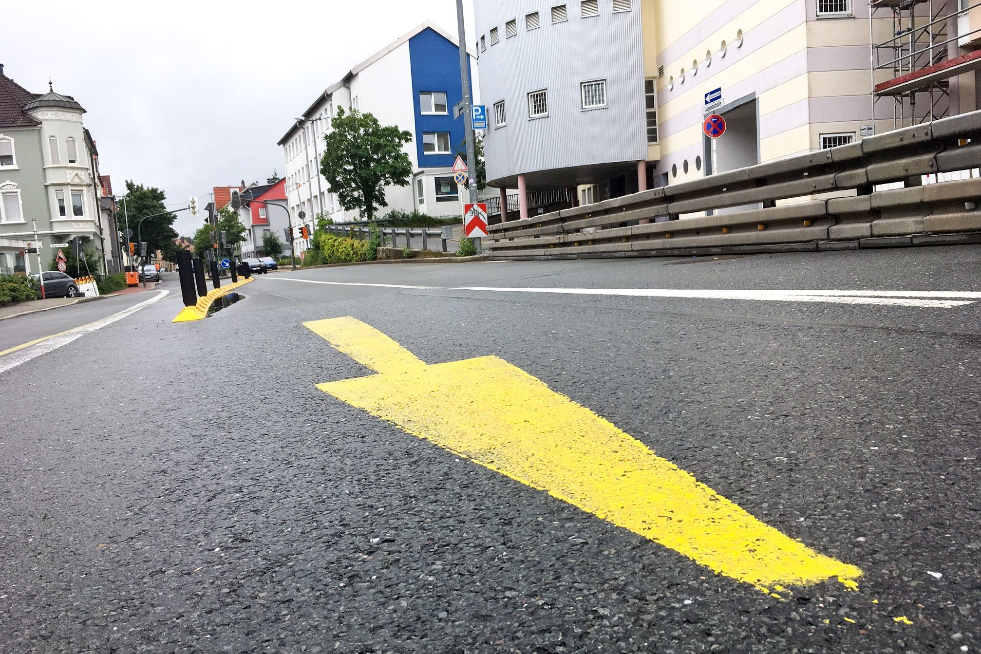 Auf der Weststraße werden die Markierungen beinahe über die gesamte Länge der Straße erneuert. Lediglich der Abschnitt zwischen der Einmündung zur Augustastraße und der Kreuzung am Rathaus-Tunnel ist davon ausgenommen und darf in Fahrtrichtung Sauerfeld befahren werden. Die Parkstraße wird für die Markierungsarbeiten zwischen den Einmündungen zur Knapper Straße und zur Weststraße voll gesperrt.