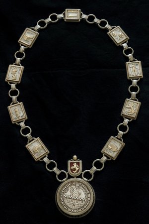 Die Amtskette liegt in einem großen, dunkelgrün ausgeschlagenen Etui. Sie hat ein Gewicht von über 800 Gramm. Allein 290 Gramm Gold wurden verarbeitet, 445 Gramm Silber, der Rest ist Elfenbein und Edelstein. Sie erzählt etwas aus 15 Jahren kommunalpolitischer Arbeit von 1945 bis 1960.