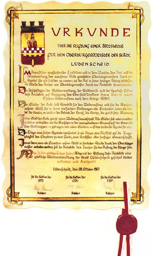 Urkunde über die Stiftung einer Amtskette für den Oberbürgermeister der Stadt Lüdenscheid