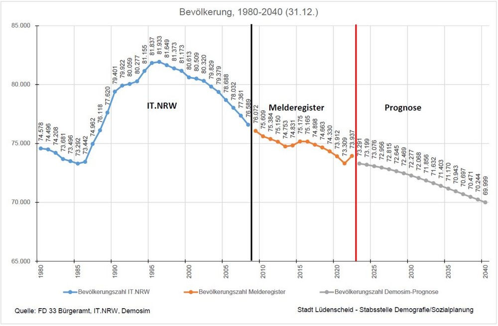 Es lassen sich vier Phasen der Bevölkerungsentwicklung seit 1980 identifizieren. Es beginnt mit einem leichten Bevölkerungsrückgang von 74.578 (1980) um 1.286 auf 73.292 Einwohner*innen 1985. Darauf folgt ein rasanter Anstieg um 8.641 auf 81.933 Einwohner*innen bis 1996. Seitdem sinkt die Bevölkerung kontinuierlich, mit Ausnahme der Jahre 2014/15. Die aktuelle Prognose der statmath GmbH (Demosim) geht von einer Weiterführung des Abwärtstrends aus. Bis 2030 sinkt die Bevölkerung auf etwa 72.122 Einwohner*innen, bis 2040 wird ein weiterer Bevölkerungsverlust auf etwa 69.603 Einwohner*innen erwartet.Die Bevölkerungsentwicklung ist von vier Faktoren abhängig: Geburten, Sterbefälle, Zuwanderung, Fortwanderung. Seit 1980 wurde nur in den Jahren 1990 und 1991 ein leichter Geburtenüberschuss von 47 bzw. 3 Personen verzeichnet. Deutliche Bevölkerungsgewinne wurden in dieser Zeit nur durch Zuwanderung erzielt. Dies sieht man aktuell eindrucksvoll am plötzlichen Anstieg der Bevölkerung zwischen 2021 und 2022, die unter anderem durch die Fluchtmigration als Folge des Angriffskrieges Russlands gegen die Ukraine erklärt werden kann. Auch für die Zukunft wird erwartet, dass die Geburten unter der Zahl der Sterbefälle liegen. Die Prognose geht von leichten Wanderungsgewinnen in den Altersgruppen 0 bis 17 Jahren sowie 25 bis 29 Jahren aus; in den anderen Altersgruppen wird von einem Wanderungsverlust ausgegangen.