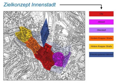 Das Zielkonzept gliedert die Innenstadt in sechs Funktionsbereiche, die jeweils eigene Qualitäten entwickeln. Die Bereiche gliedern sich in City, die Altstadt, die Oberstadt, die Vordere Knapper Straße, die Hintere Knapper Straße und den Entwicklungsbereich Bahnhof.