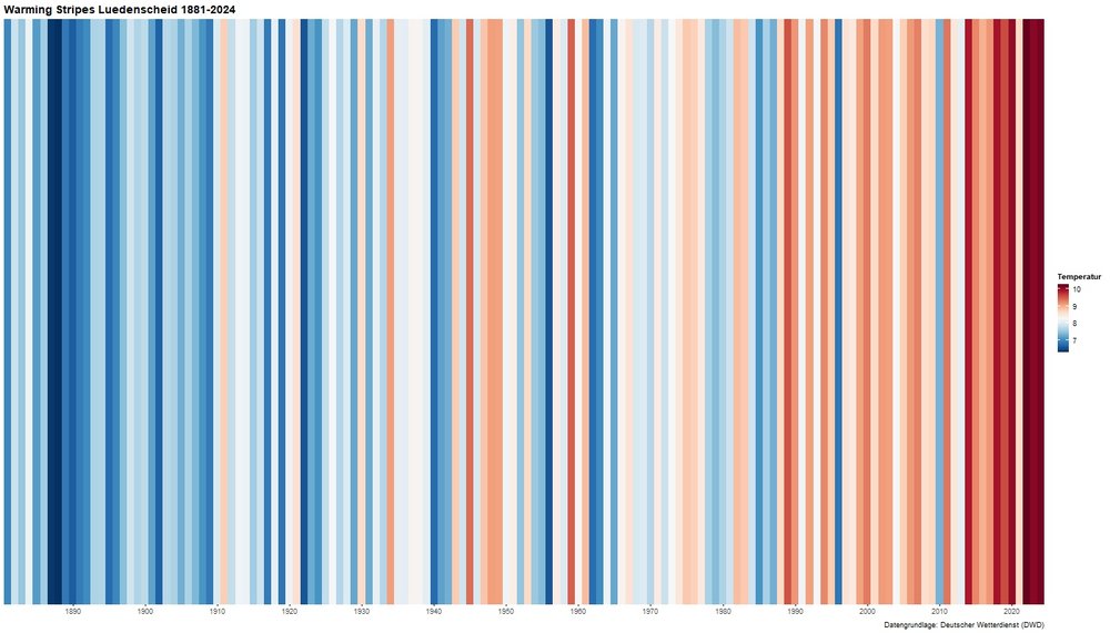 Diese stellen für Lüdenscheid die mittlere Jahrestemperatur dar. Die Daten werden dabei chronologisch seit Messbeginn aufgetragen. Die einzelnen Jahre werden als farbcodierte Streifen dargestellt, das kälteste Jahr erscheint dunkelblau, das wärmste dunkelrot. Das kälteste Jahr trat in Lüdenscheid 1888 mit 6,3 °C im Schnitt auf. Das wärmste Jahr war 2022 mit 10,2 °C im Schnitt. Das aktuellste Jahr 2024 liegt auf Platz 2 mit ebenfalls 10,2 °C.