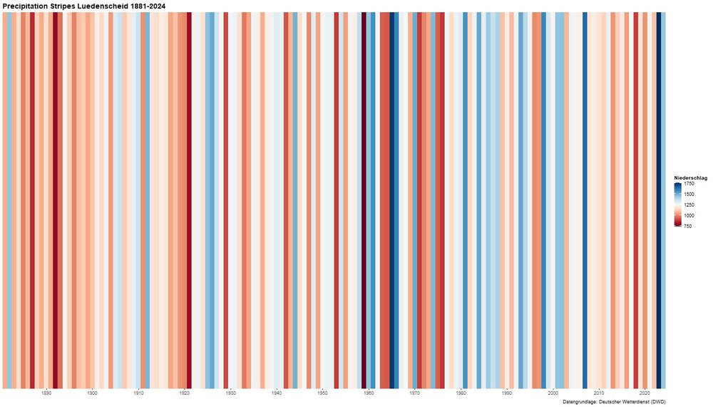 Die Precipitation Stripes zeigen den Jahresdurchschnitts Niederschlag. Die niederschlagsreichsten Jahre werden dunkelblau dargestellt, die niederschlagärmsten Jahre dunkelrot. Das trockenste Jahr war 1959 mit 724 mm Niederschlag, das nasseste Jahr 2023 mit 1755 Niederschlag.