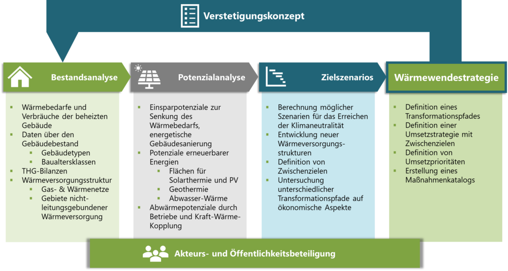 Der Ablauf der Wärmeplanung ist gesetzlich festgeschrieben und beinhaltet eine Analyse des Bestandes, das Aufzeigen von möglichen Potenzialen zur Einbringung erneuerbarer Energie, die Untersuchung von Zielszenarien, sowie das Entwickeln einer Wärmewendestrategie.